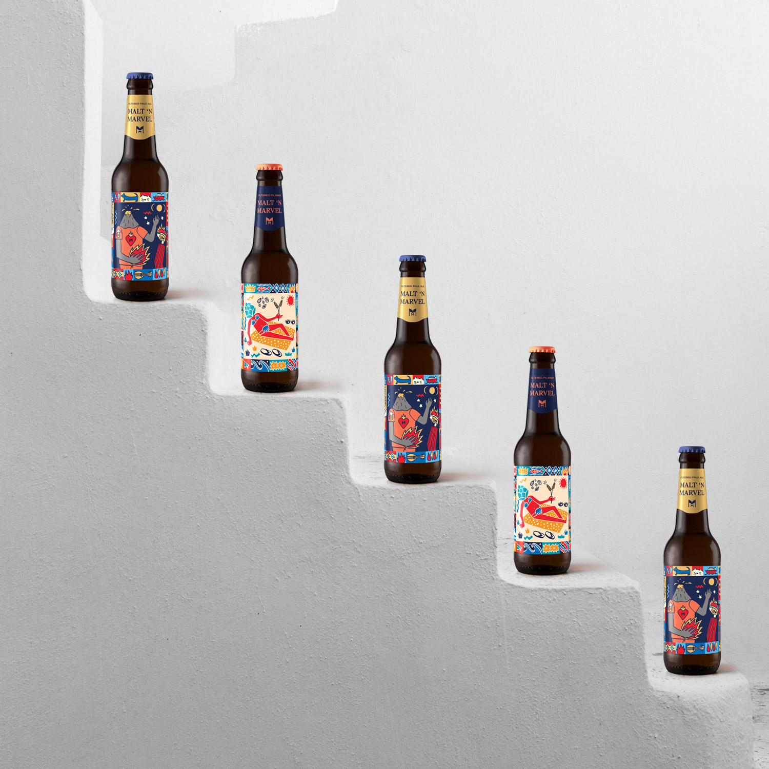 Malt ‘n Marvel beer of Ftelos Brewery in Santorini, is targeted at the local market, a market with a huge percentage of tourists from all over the world. This means an extremely broad audience and a non-existent brand loyalty. Based on these facts we wanted to create a product with a strong differentiation. A product that stands out in the brewery crowd, with a name and a brand identity that highlights the uniqueness of Santorini, a product that is fun, because after all, drinking beer is fun too!